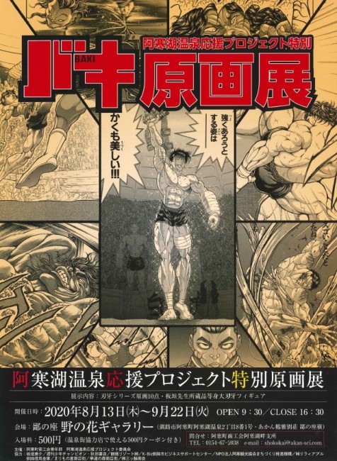 原画展は“阿寒湖温泉応援プロジェクト”の一環で、作者の板垣恵介先生が少年期に阿寒湖温泉に住んでおり、阿寒湖商店街のためならば、と原画をお借りすることが出来、開催する運びとなりました。