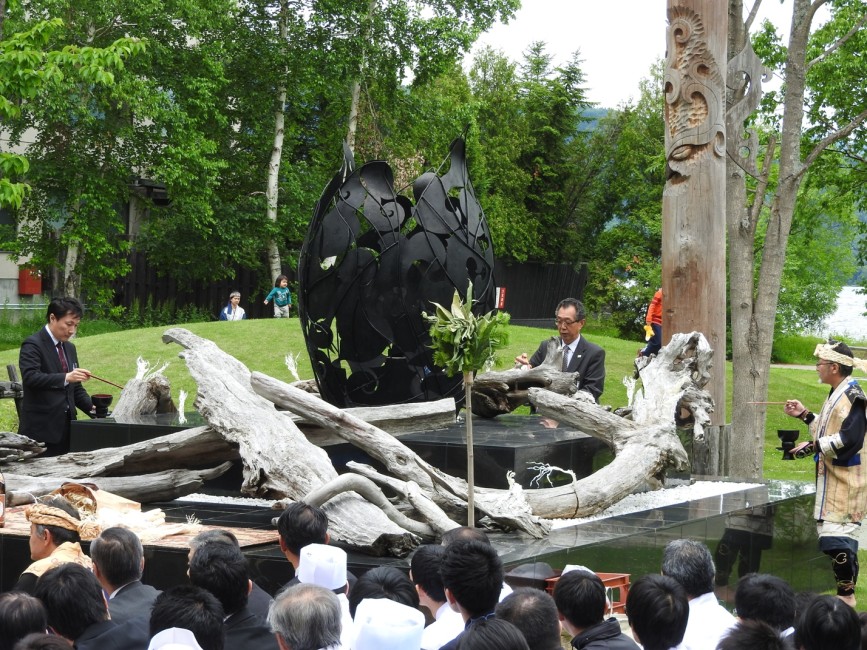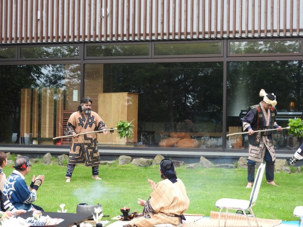 アイヌ民族の代表や、アイヌの民族衣装を身にまとった鶴雅グループ代表大西雅之や、従業員が集い、
