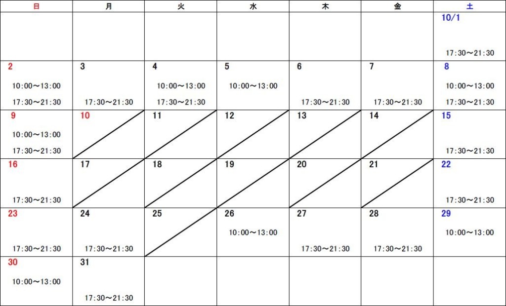 2022年10月は以下の日程で営業いたします。