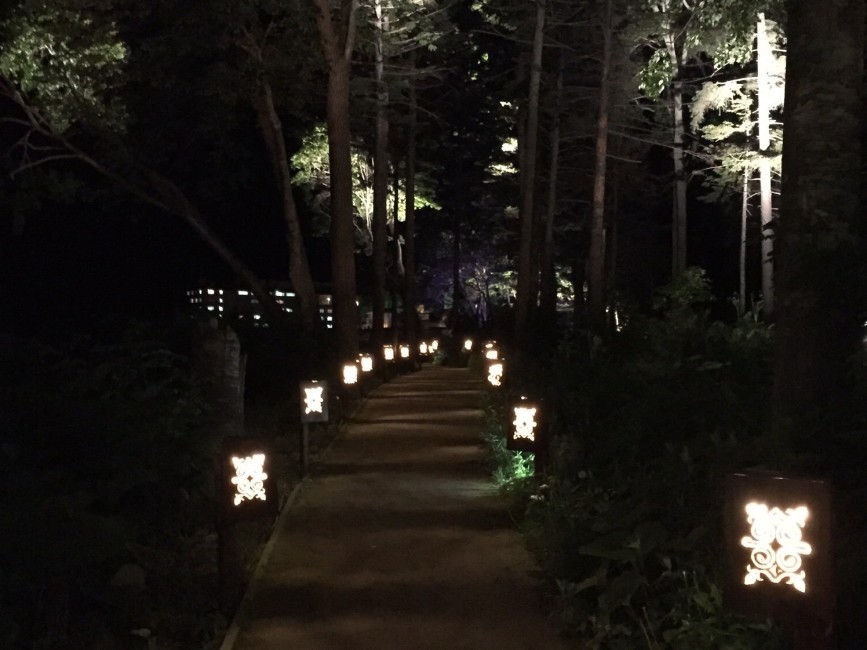 また、小径の中にはアイヌの美術作品も展示されておりますので、探しながら夜の散策をお楽しみください。