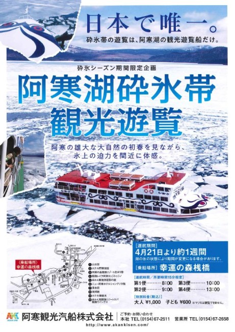 阿寒湖の春の風物詩「阿寒湖砕氷帯観光遊覧」は、4月21日(日)より運航を開始致します。